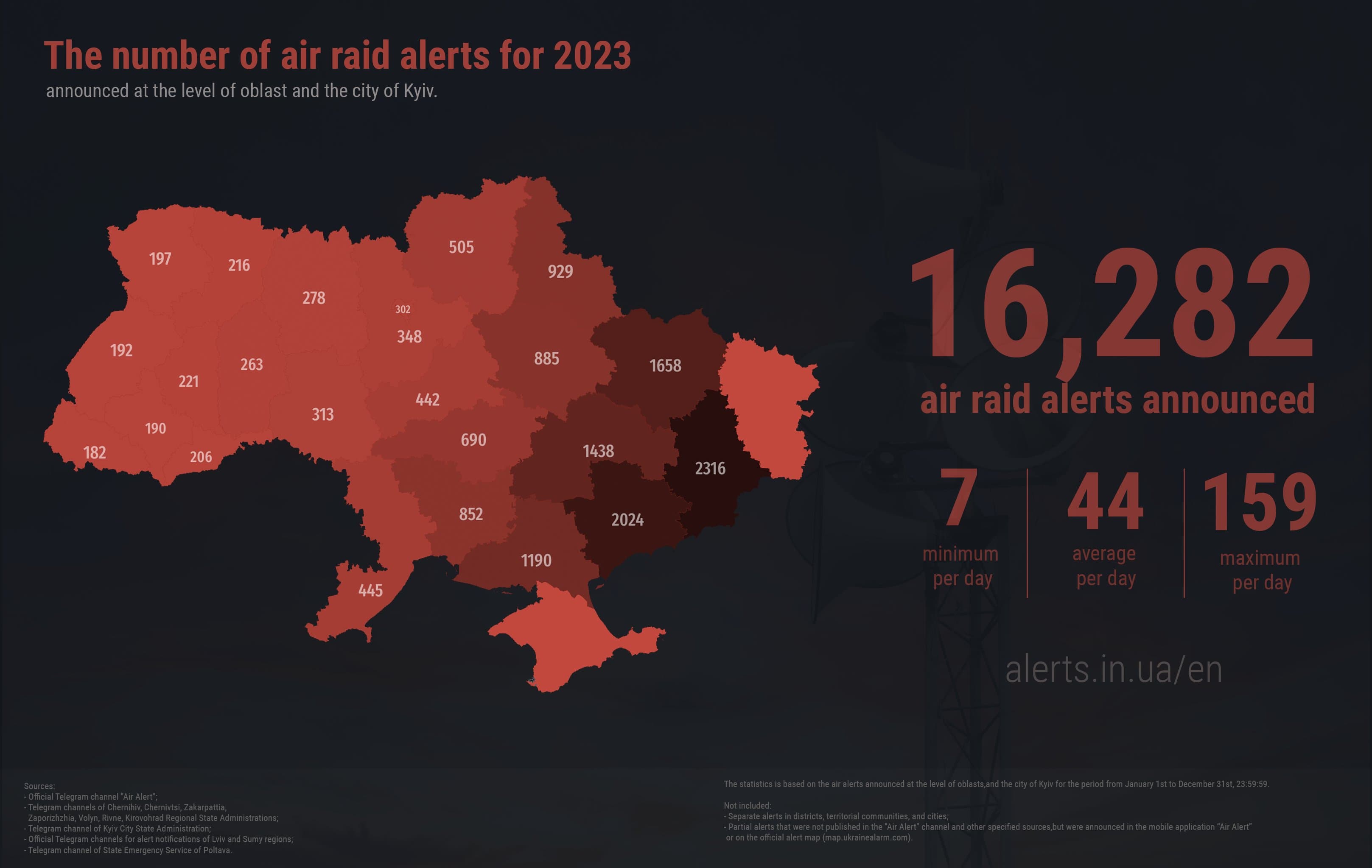 У середньому за добу було 44 повітряні тривоги. Найменше – 7, а найбільше – 159 за день. Найбільше повітряних тривог оголошували у Донецькій області – 2 316. Далі за кількістю тривог ідуть Запорізька (2 024), Харківська (1 658) та Дніпропетровська (1 438) області. Найменшу кількість тривог оголошували на Закарпатті (182).