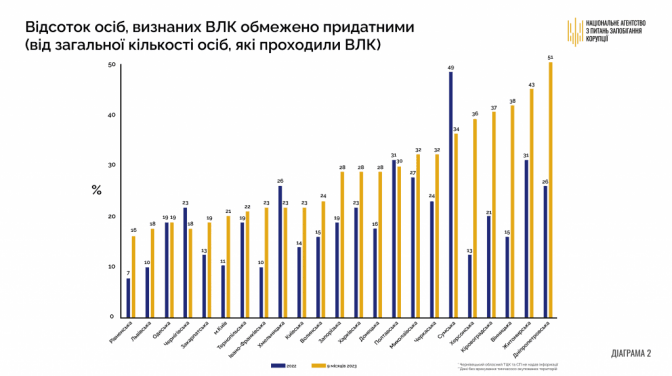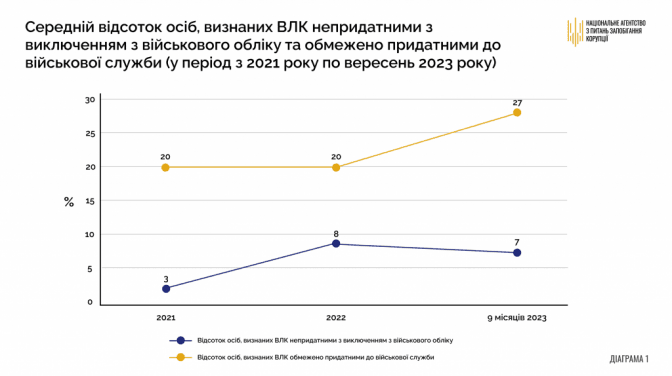 Агентство встановило, що останнім часом спостерігається зростання більше ніж удвічі середнього відсотка непридатних осіб за 9 місяців 2023 року порівняно з показником 2021 року (на 4 процентних пункти). Також зріс середній відсоток обмежено придатних осіб (на 7 п.п.).