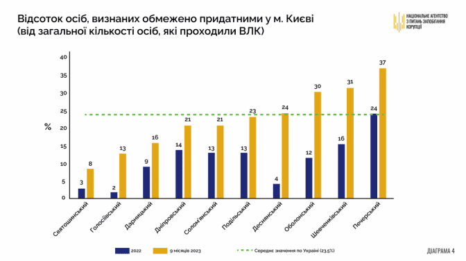 У 2023 році спостерігається значне перевищення середнього значення 23,5% (за період з 2022 до вересня 2023 р.) встановлення обмеженої придатності осіб до військової служби в Печерському (на 13.5 п.п.), Шевченківському (на 7.5 п.п.) та Оболонському (на 6.5 п.п.) районах м. Києва.