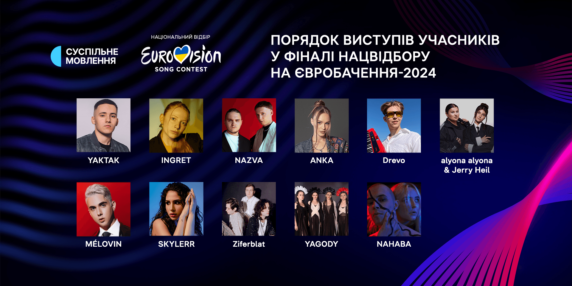 Сьогодні, 3 лютого, стане відомо, хто представить Україну на Євробаченні-2024 у шведському Мальме. Фінал Національного відбору розпочнеться о 18:00, трансляції відбуватимуться на всіх платформах Суспільного Мовлення.