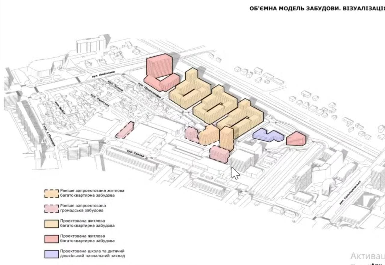 Планують облаштувати три квартали житлової забудови, між якими чотири проїзди. Кожен житловий квартал передбачатиме близько шести будинків. Є пропозиція зробити житловий комплекс змішаної поверховості.