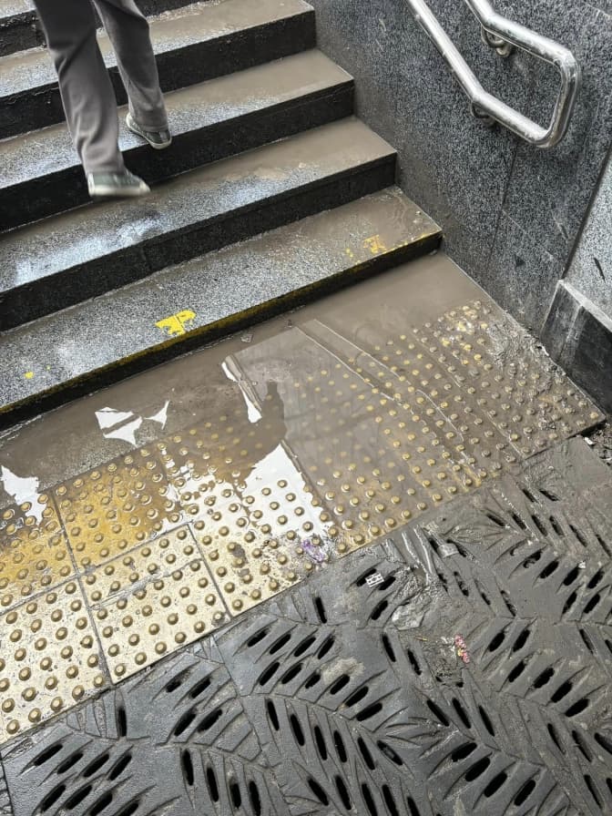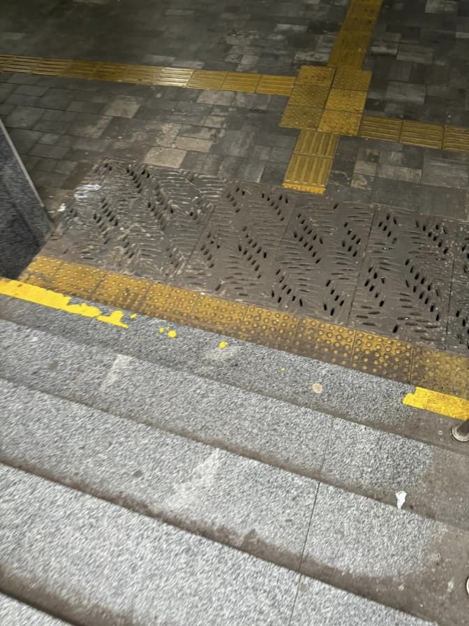 Як видно зі світлин, в переході зірвалась тактильна плитка та постирались попереджувальні лінії. Також, не працюють ліфти.