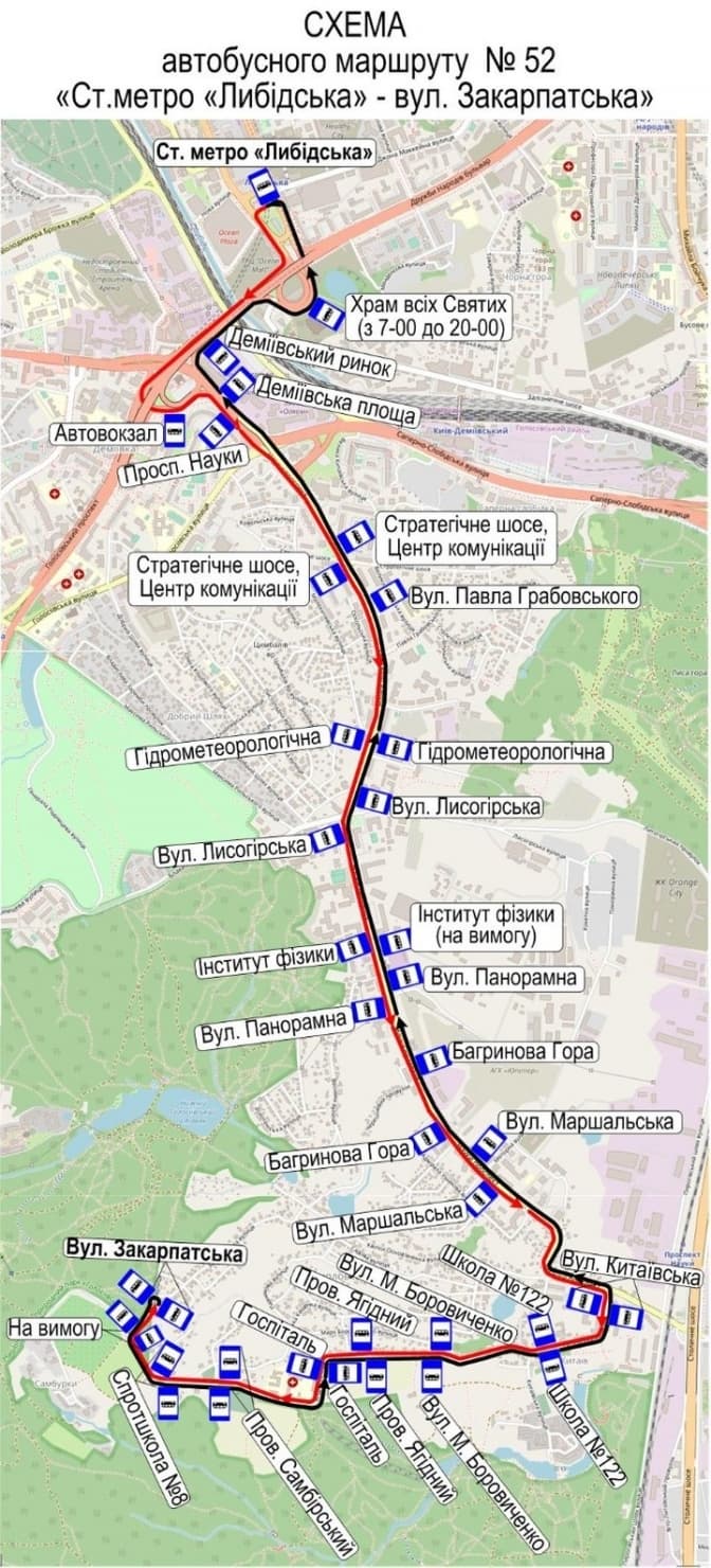 У Києві з 2 березня, відновлює роботу автобусний маршрут № 52 «Вулиця Закарпатська — станція метро "Либідська"». Про це повідомляє Департамент транспортної інфраструктури Київської міської державної адміністрації.