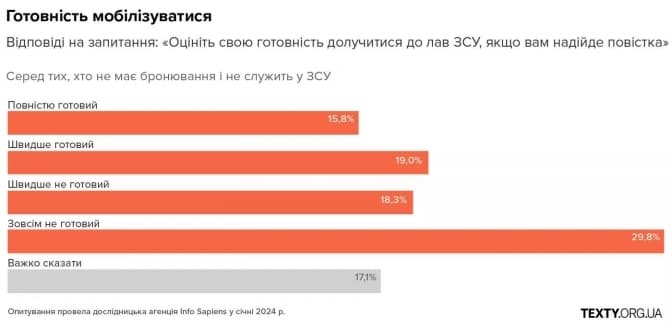 48,1% опитаних чоловіків призовного віку в Україні не готові мобілізуватися. Їх, зокрема, лякають смерть і можливість потрапити до поганого командира. Натомість 35% чоловіків готові долучитися до Збройних сил України. Про це йдеться в результатах соціологічного опитування дослідницької агенції Info Sapiens.