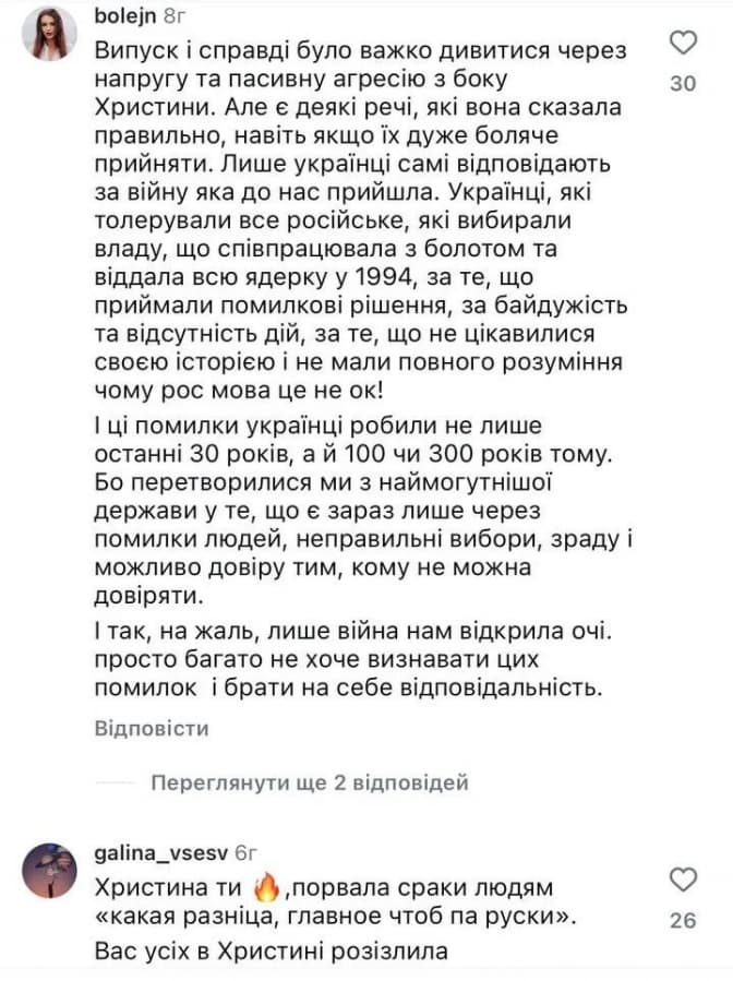 Після перепалки ведуча зазначила, що коли Україна відділилась від срср, то поступово розпочала перехід на українську, і вона б завершила цей шлях, але зараз це все дається великими втратами.