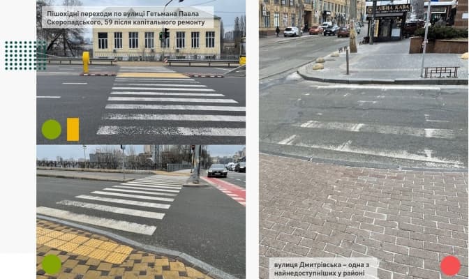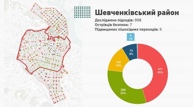 Зокрема, у Шевченківському районі, попри вищу кількість нормативних пішохідних переходів, поза вулицями з капітальними ремонтами доступність дуже точкова.