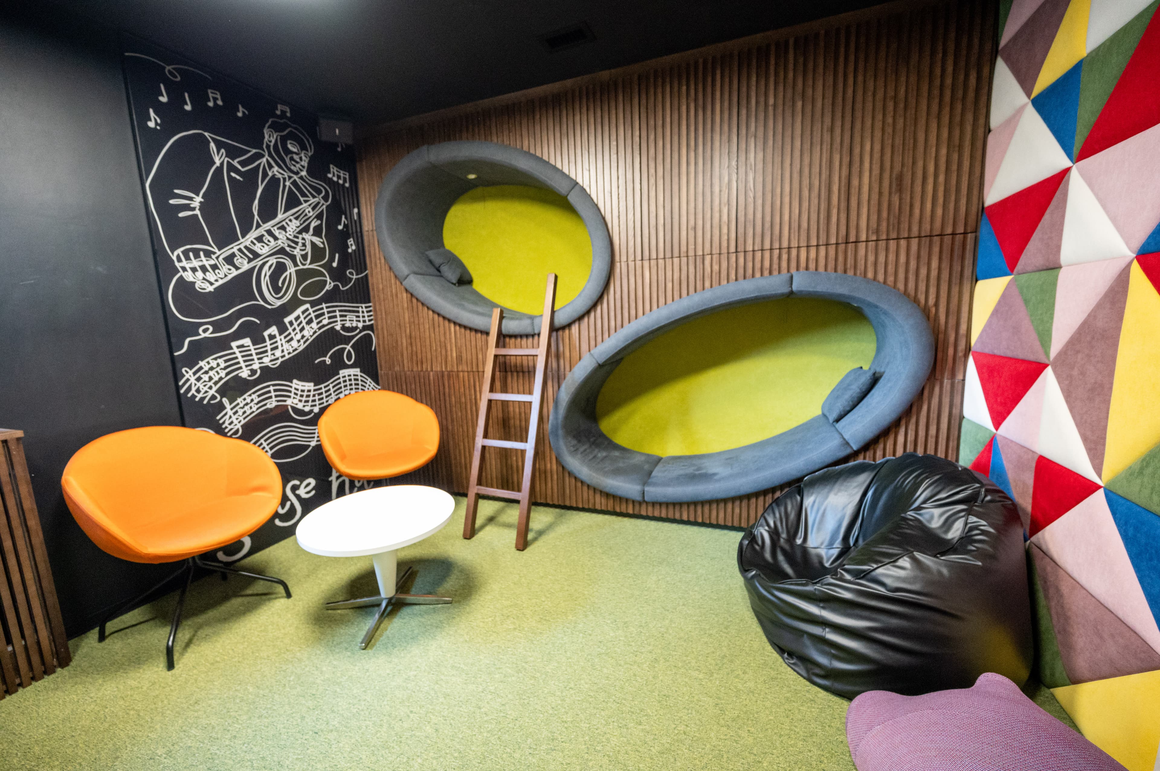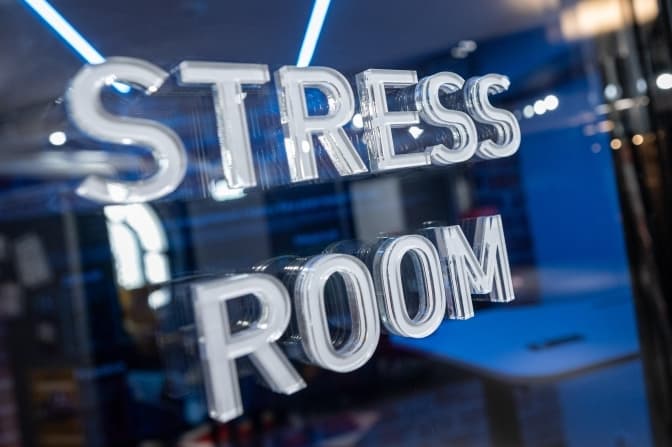 Є тут і свої фішки, наприклад stress room, де після важких перемовин можна побити боксерську грушу, стати на бігову доріжку, оснащену столом для ноутбука, скористатися надрукованою на стіні інструкцією для подолання стресу без реєстрації та смс.