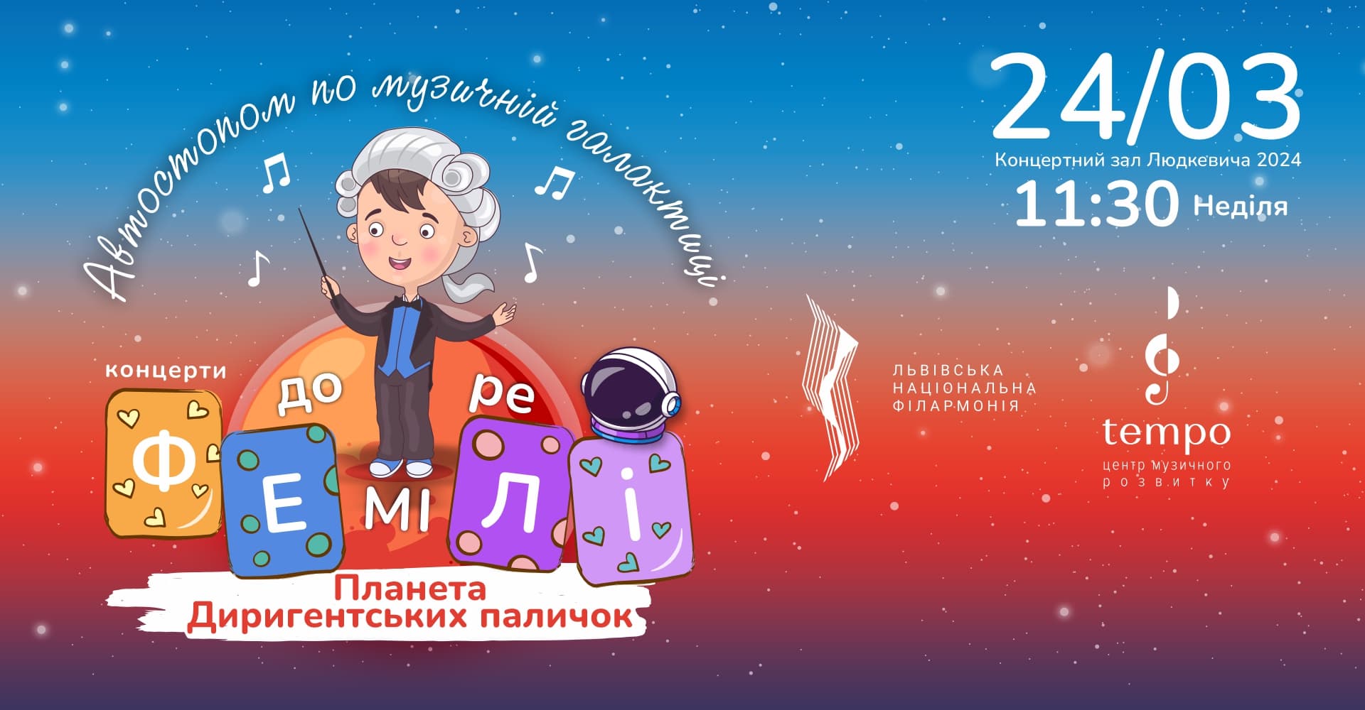 У неділю, 24 березня, об 11:30 у Львівській національній філармонії пройде черговий концерт із циклу музичних пригод дитячого героя Дзень-Бума та його друзів. Однак концерт буде особливим – у рамках Бахівського маратону маленьких слухачів чекає інтерактив з пошуку справжніх диригентських паличок. З юним дослідником Музичної галактики Дзень-Бумом трапилася пригода: він повинен віднайти спеціальне знаряддя, яке допоможе усьому оркестру грати злагоджено і гармонійно.