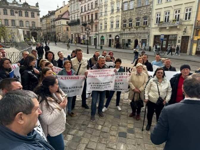 У вівторок, 2 квітня, біля львівської Ратуші на площі Ринок люди мітингували проти забудовника «Рубікон-груп», який протермінував здачу куплених квартир на 4 роки. Про це Tvoemisto.tv розповів співорганізатор мітингу та один із вкладників ЖК «Rubicon City» Віталій Дігуєць.
