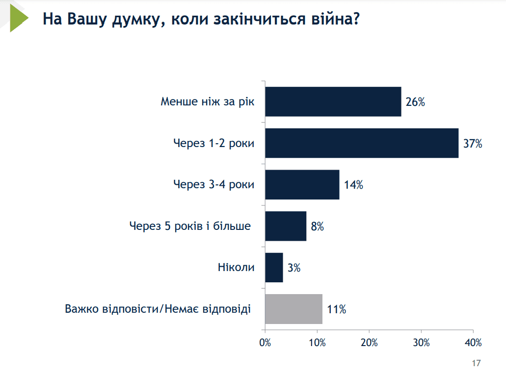 Натомість лише 26% опитаних вірять у те, що війна завершиться цьогоріч. Більшість, а саме 37%, все ж таки вказали, що повномасштабне вторгнення прпиниться через 1-2 роки.