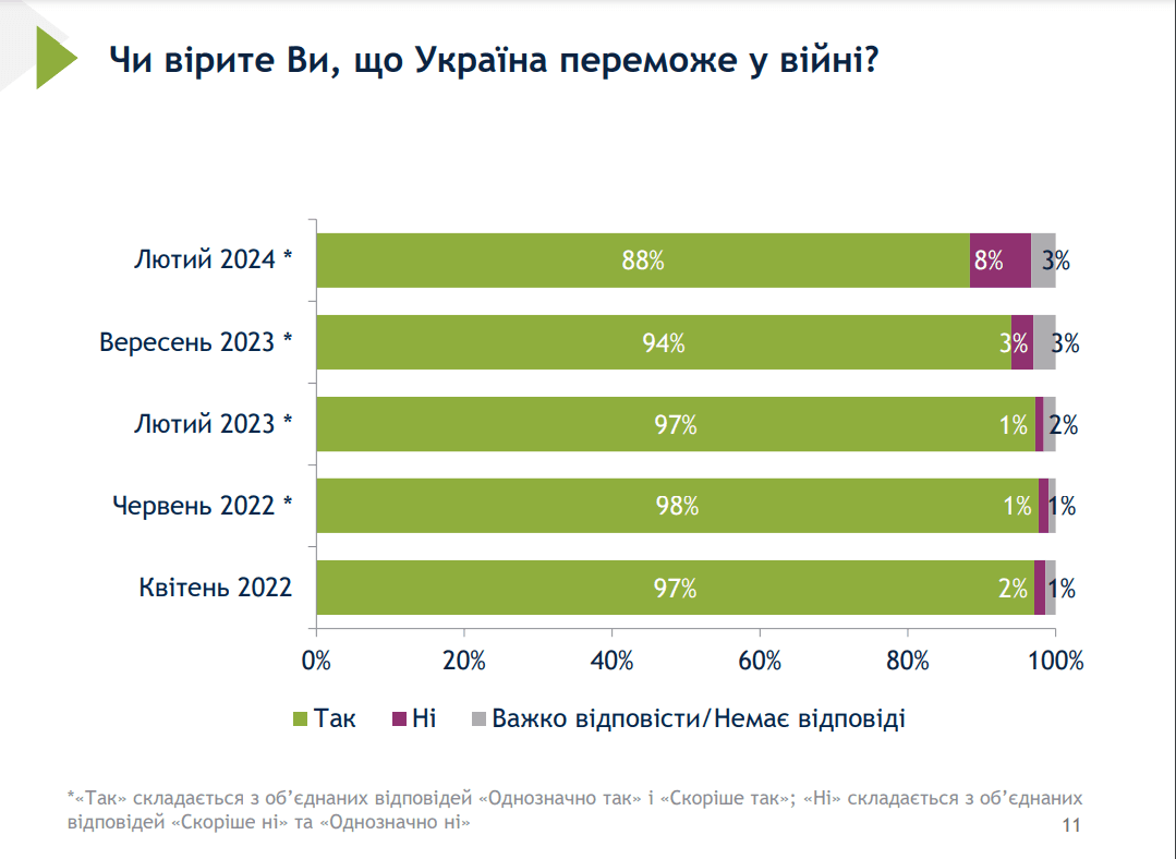 Також згідно з дослідженням, у лютому 2024 року менше українців впевнені у перемозі Україні у війні, ніж у 2022 році. Наразі 88% респондентів вважають, що Україна переможе росію.