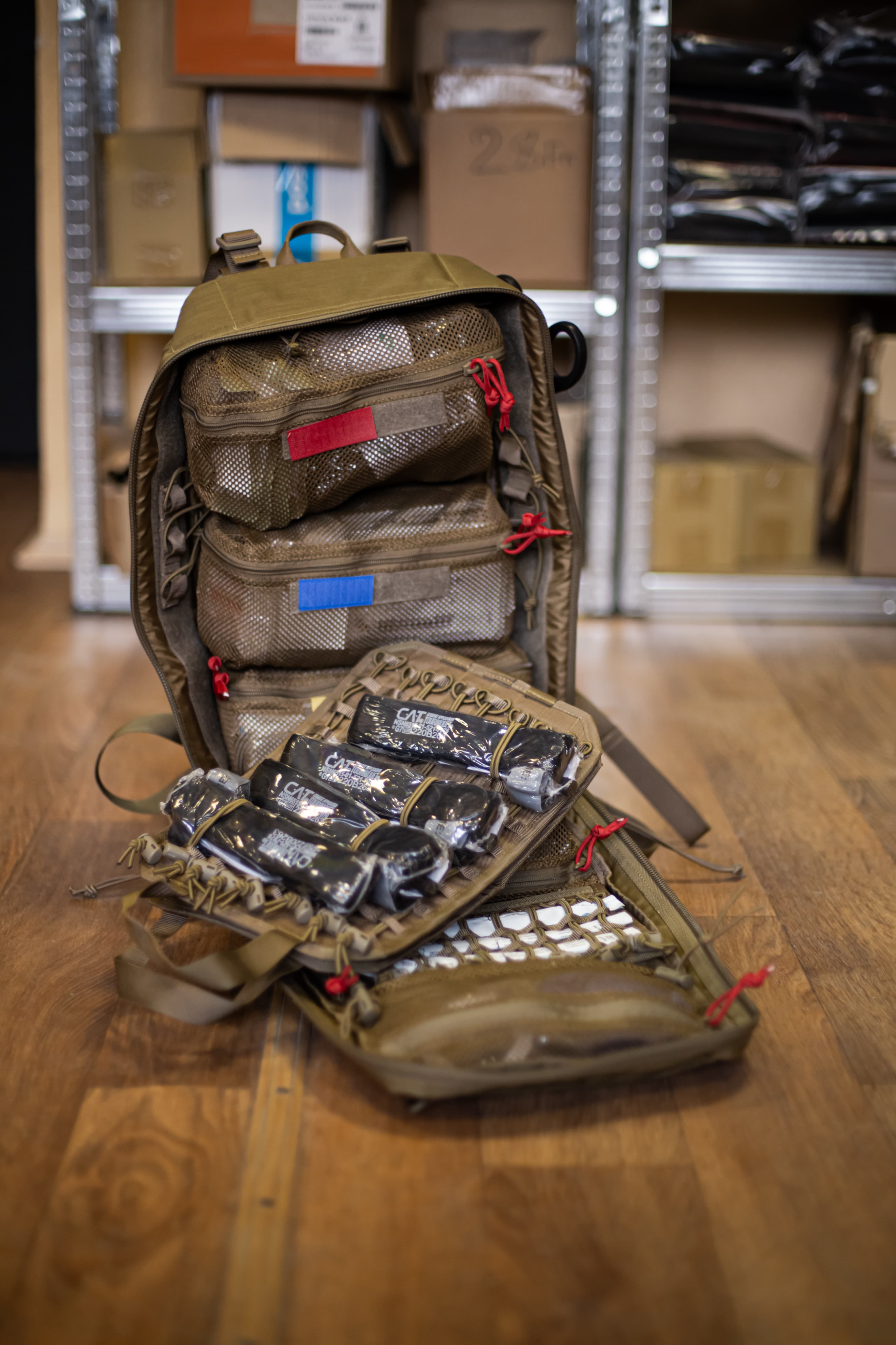 Перші два варіанти, прості й компактні, переважно беруть взводні медики, а також розвідка і штурмовики. А от третій, найбільший, скоріше підходить старшим бойовим медикам, евакуаторам. Це люди вже з більшими навичками, знаннями, їм доступно до виконання більше маніпуляцій з пораненим. Тому й до базової комплектації їх рюкзака ми пропонуємо їм достатньо складну лінійку девайсів: набори внутрішньокісткового доступу, вузлові турнікети, аспіратори, мішки амбу тощо.