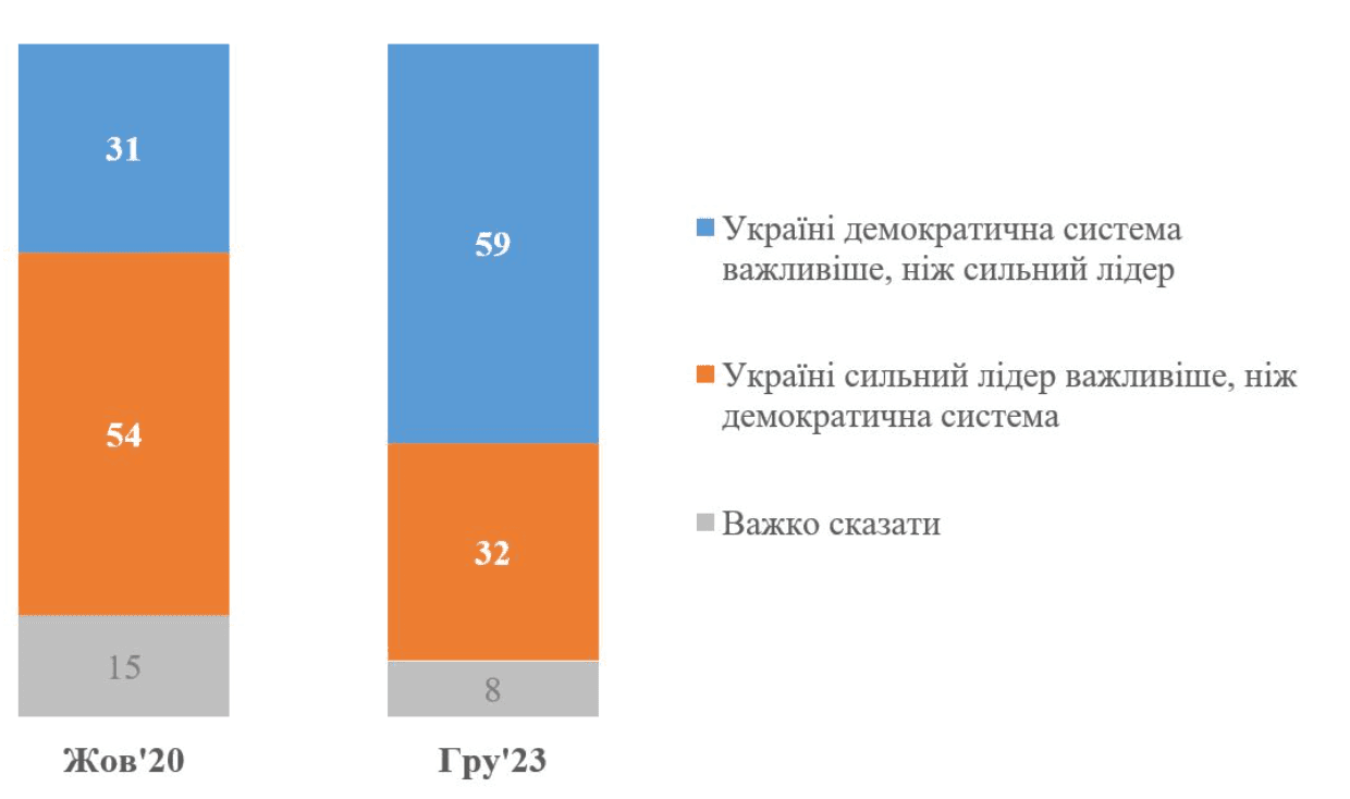 Подібне питання було поставлене у жовтні 2020 року, але без акценту на «зараз», тобто запитувалося про загальний пріоритет. Тоді 54% віддали перевагу сильному лідерові, а 31% – демократичній системі, що відповідало потребам, виявленим у опитуванні у липні 2022 року. У грудні 2023 року більшість українців (59%) визнали, що для України важливіша демократична система. Частина тих, хто підтримував ідею сильного лідера, склала 32%.