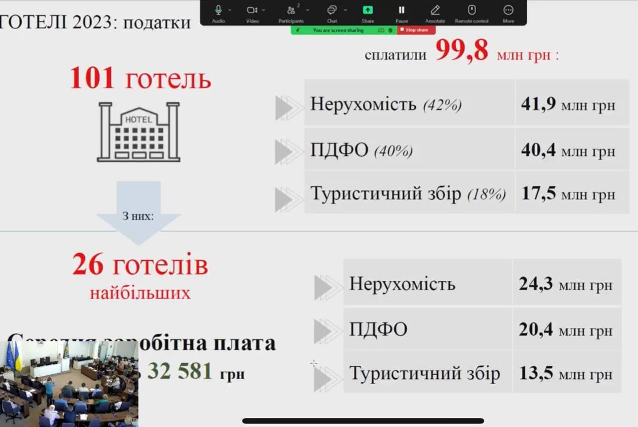Як доповіла директорка департаменту Інна Свистун, загалом 101 готель працює у Львові та генерує 99,8 млн гривень різних податків до міського бюджету. До аналізу взяли 26 найбільших готелів, які генерують майже половину ПДФО, яке генерують готелі - 20,4 млн гривень.