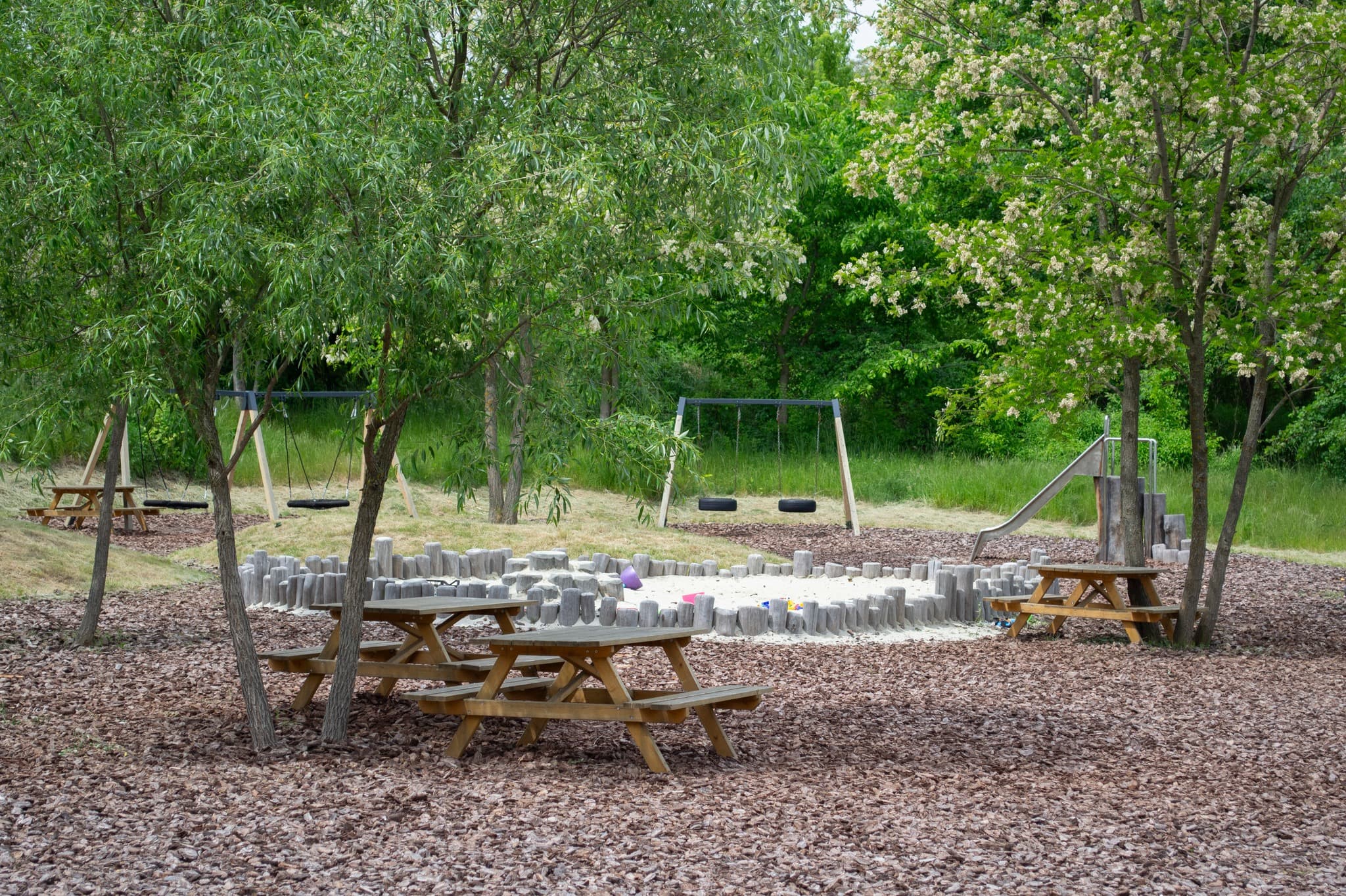 Сам формат цього прихистку для жінок-переселенок при надії передбачав створення біля нього ігрового майданчика. Тут також переважають природні матеріали, є багато різних елементів для дітей. А для дорослих як бонус – гарна відпочинкова зона з озером.