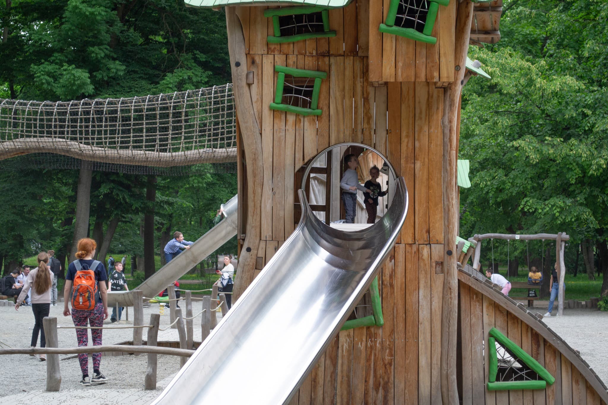 Майданчик створений за європейськими технологіями. Усі конструкції – виготовлені з дерева. Тут є гойдалки, балансири, лазанки і вежа-лабіринт у вигляді замку. Виготовив їх німецький виробник Wesendorfer Kinderland, який спеціалізується на дитячих майданчиках з натурального дерева. За рівнем якості і безпеки вони відповідають німецьким стандартам.