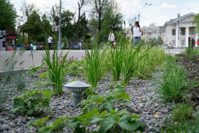 Дощові садки мають вигляд заглиблених клумб, оточених вологолюбними і стійкими до спеки багаторічними рослинами.