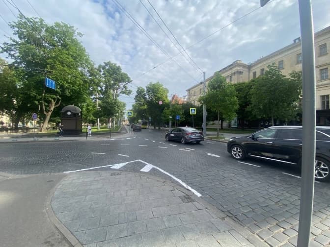 - поруч з пам’ятником Тарасові Шевченку нанесли дорожню розмітку 1.7, що позначає напрямок смуг руху в межах перехрестя,