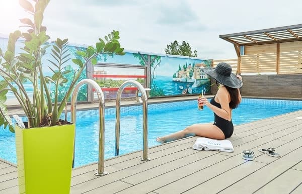 Відкритий басейн просто неба, який розташований на даху торгового центру. Шезлонги, дитяча зона, спа-процедури та можливість перекусити поруч.