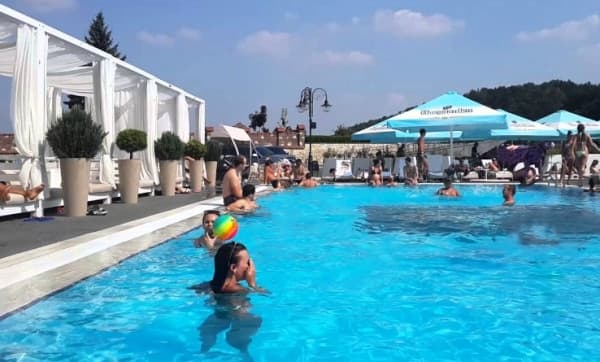 У розважальному комплексі є 3 відкриті басейни – для дорослих, підлітків та дітей. А також на території комплексу є ігрові зони, спортивні майданчики та ресторани.