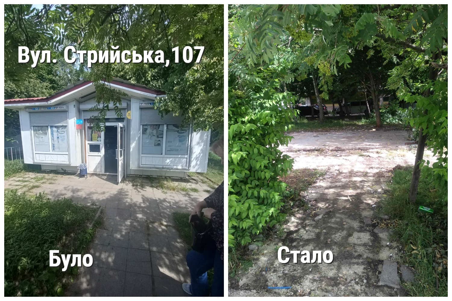 Власники мали можливість здійснити демонтаж павільйонів у самостійно добровільному порядку. Тож вони забрали павільйони з комунальної землі. На вул. Стрийській, 107 власник також прибрав покриття.