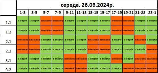 - з 23:00 до 00:00 відключення під час червоних та білих клітинок графіку.