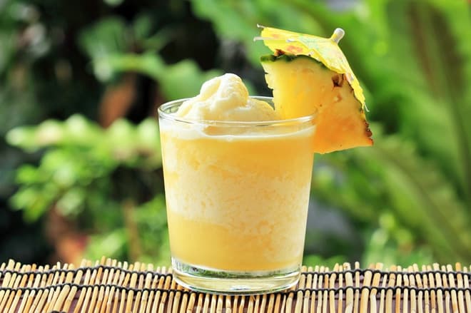 Всі інгредієнти охолодити, збити у блендері до однорідності. Налити коктейль у склянки, прикрасити збитими вершками і шматочками ананаса.