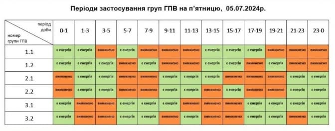- з 23:00 до 24:00 відключення двох черг (червоні та частина білих клітинок графіку).