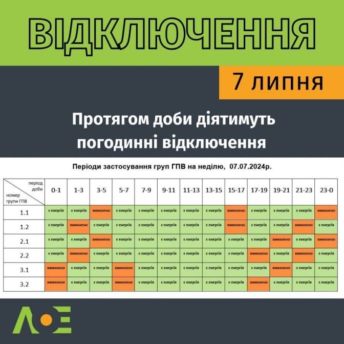 - з 00:00 до 7:00 відключення двох черг (червоні та частина білих клітинок графіку);