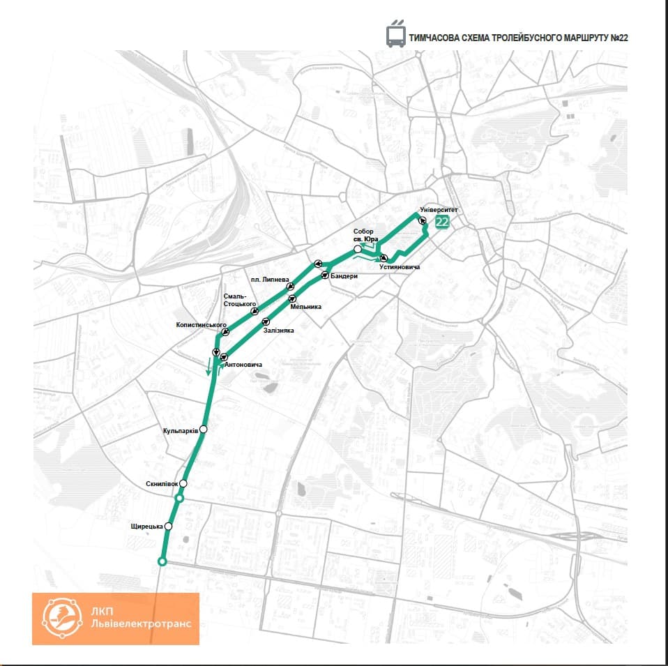 Тролейбуси №22 курсуватимуть за скороченим маршрутом – від Університету до ТРЦ «Вікторія Гарденс» та в зворотному напрямі.