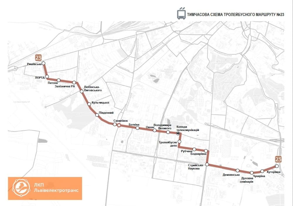 Тролейбуси №23 їхатимуть з вул. Ряшівської до перехрестя проспектів Івана Павла ІІ та Червоної Калини та в зворотному напрямі. До зупинки «Боднарівка» тролейбуси їхатимуть за своїм звичним маршрутом, далі – по просп. Івана Павла ІІ до просп. Червоної Калини (зупинка «Хуторівка») та у зворотному напрямі.
