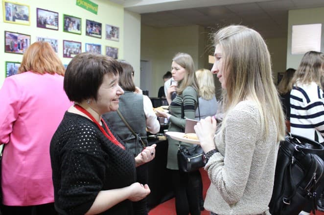 На фото: Наталя Маркевич (ліворуч) спілкується з гостями зустрічі «Крила збирають друзів у Золочівській громаді»