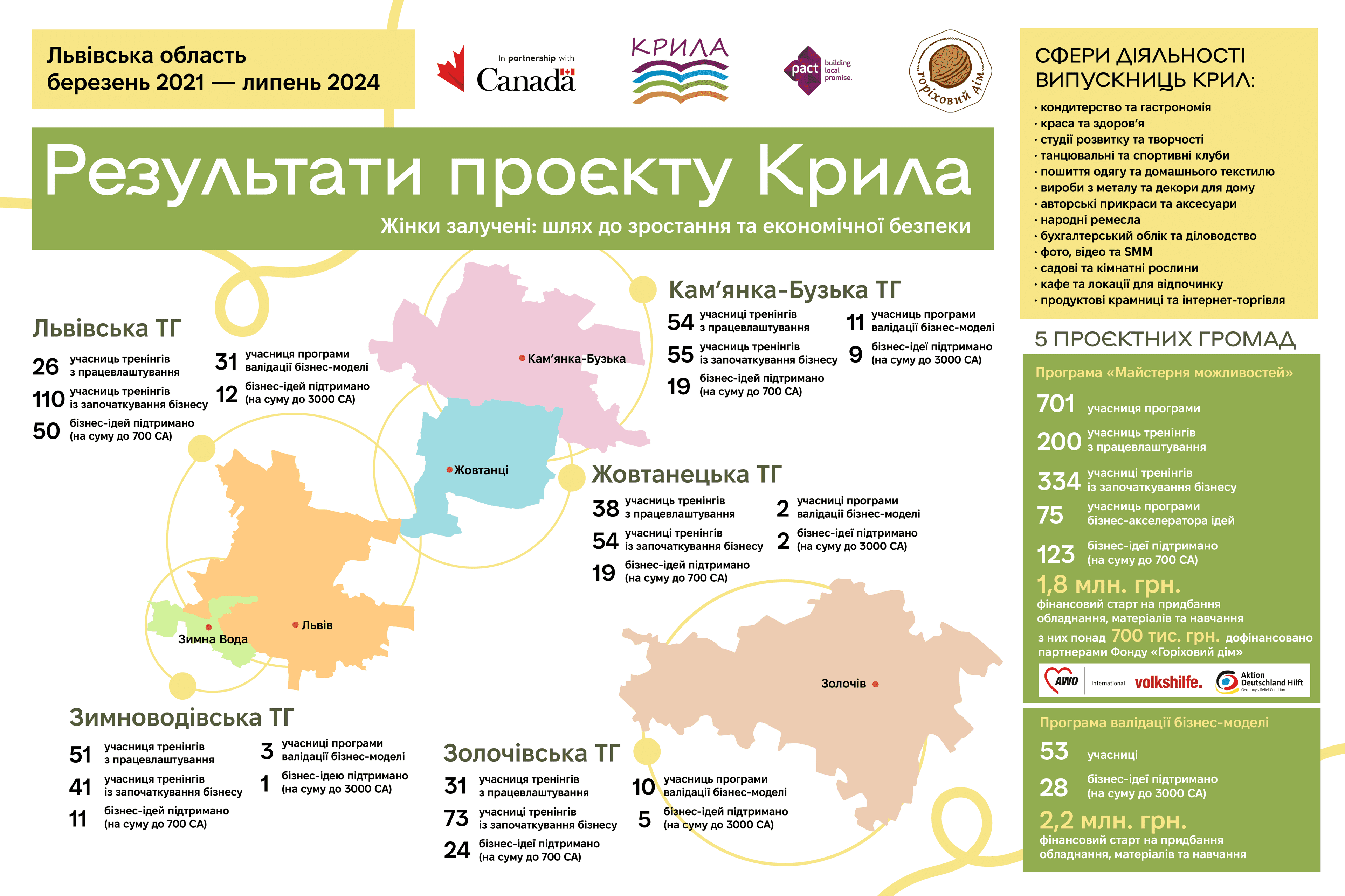Із березня 2021 року у 5-ти громадах Львівщини – Жовтанецькій, Золочівській, Зимноводівській, Кам’янка-Бузькій та Львівській – працює проєкт «Крила» (Жінки залучені: шлях до зростання та економічної безпеки). Цей проєкт спрямований на покращення добробуту жінок із найбільш вразливих категорій населення, зокрема тих, що проживають у сільській місцевості, постраждали від домашнього насильства, виховують дітей з інвалідністю чи мають обмежену можливість працювати, вимушених переселенок, ветеранок та партнерок військових.