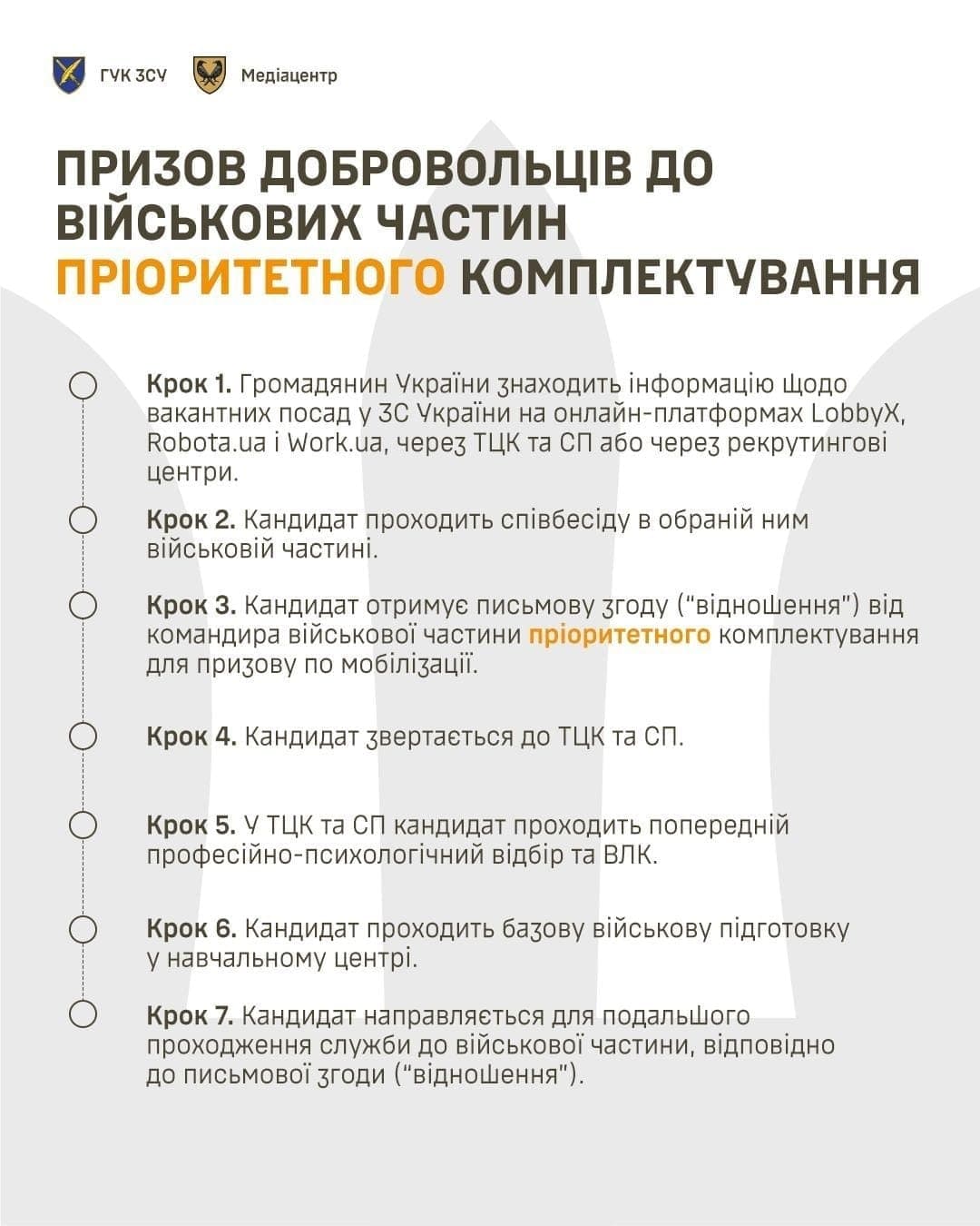 Частини, які Генеральний Штаб 3С України визначає для ТЦК та СП і навчальних військових частин як такі, що є пріоритетними для комплектування особовим складом. Перелік пріоритетних частин формується відповідно до нагальних потреб військ (сил) та рішень керівництва 3С України. Чи є підрозділ пріоритетним, кандидат може дізнатись після проходження відбору та співбесіди виключно у представника підрозділу.