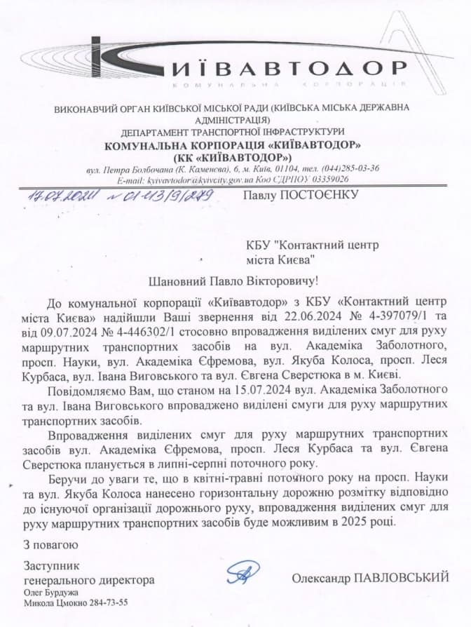 «Київавтодор» облаштує смуги громадського транспорту на проспекті Леся Курбаса, що на Борщагівці. Про це йдеться у відповіді комунальної служби на запит активіста ГО "Пасажири Києва" Павла Постоєнка.