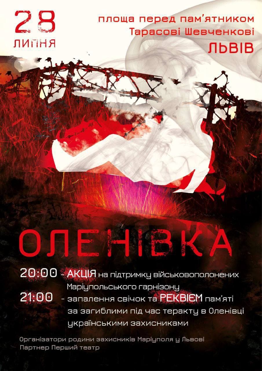 Сьогодні перед пам’ятником Тарасу Шевченку у Львові пройде акція на підтримку військовополонених Маріупольського гарнізону та запалення свічок та реквієм пам’яті за загиблими під час теракту в Оленівці. Організаторами є родини захисників Маріуполя у Львові.