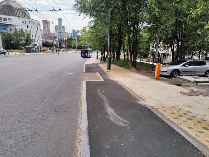 У рамках капітального ремонту вулиці Митрополита Василя Липківського облаштували односторонні велосипедні доріжки з обох сторін вулиці. Місце заїзду на прилеглу територію, яке має бути в один рівень з проїзною частиною, біля підземних комунікацій обрамили у бордюр прямо на велосипедній доріжці.