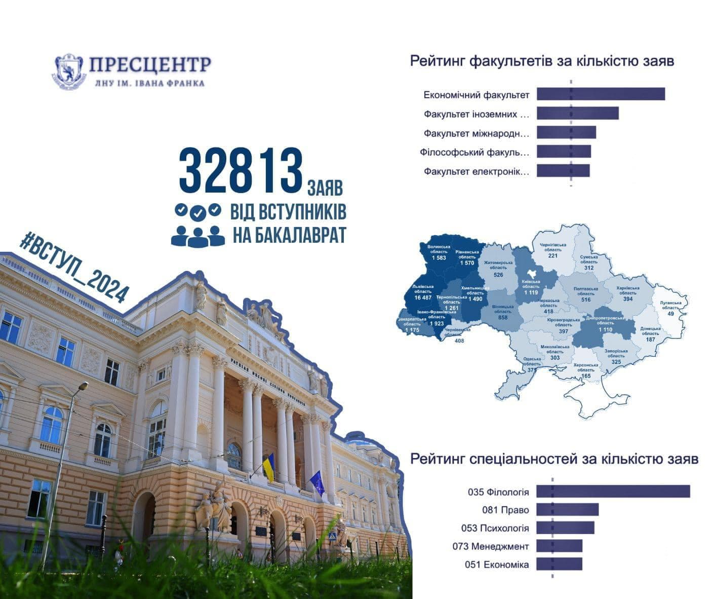 Найбільше охочих стати студентами Львівського університету серед мешканців Львівської області – 16 487 заяв. Водночас чимало цьогорічних абітурієнтів є представниками Івано-Франківської області (1923 заяви), Волинської (1583 заяви), Рівненської (1570 заяв), Хмельницької (1490 заяв), Тернопільської (1261 заява), Закарпатської (1175 заяв), Київської (1119 заяв) та Дніпропетровської (1110 заяв).