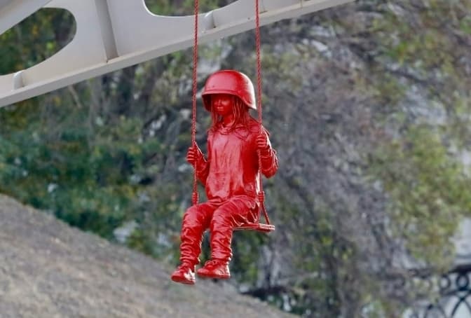 Читайте також: На Майдані Незалежності встановили ще одну скульптуру Коломіни. Нова робота митця – це червона дівчинка в завеликій для неї касці, яка катається на гойдалці на мосту над Алеєю Героїв Небесної Сотні.