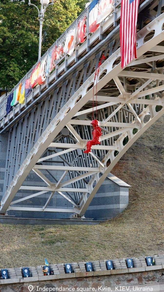 Нагадаємо, перед цим на Майдані Незалежності з'явилась скульптура Джеймса Коломіни, створена ним до Дня Незалежності України. Це червона дівчинка в завеликій для неї касці, яка катається на гойдалці на мосту над Алеєю Героїв Небесної Сотні.