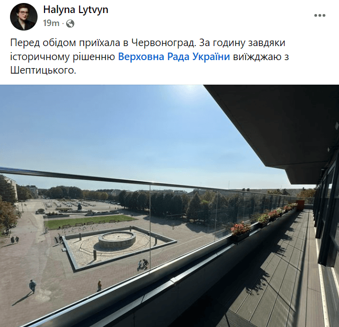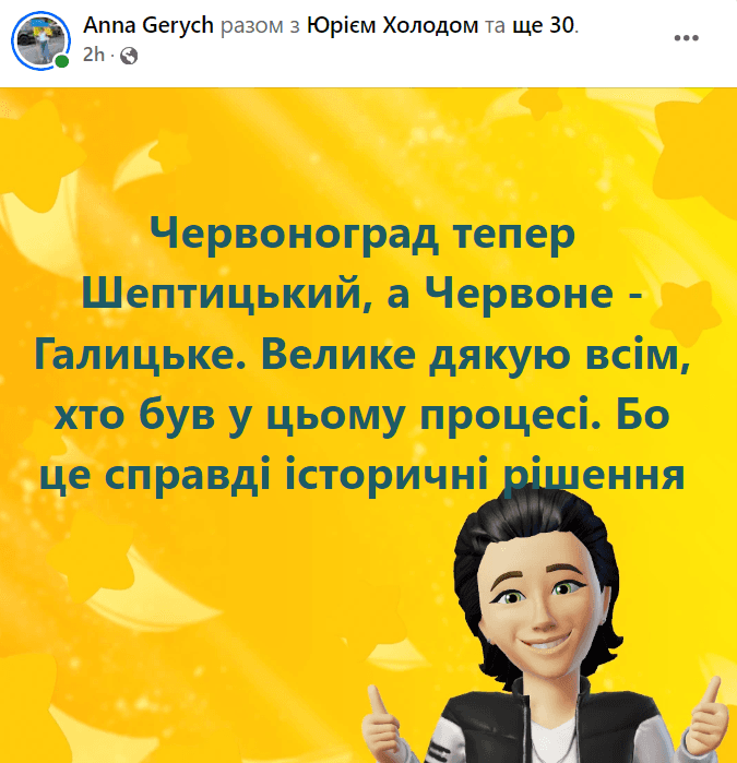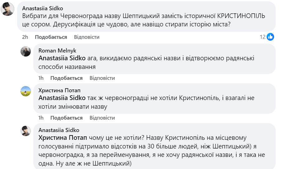 «Чітко і ясно було сказано – місто перейменують. Обирайте нову назву. Самі. Бо за вас це зроблять, і тоді вже не питатимуть... Навіть слухати не хотіла більшість. Тільки обурення і несприйняття невідворотного... Так, мені теж не дуже подобається назва «Шептицький». Але коли нема нормальної цивілізованої дискусії, то сталося те, що маємо. Тому не жеріть одне одного. Не проклинайте. Найбільша проблема в країні – це наші вороги, війна. От і спрямуйте свою агресію в цьому напрямку».