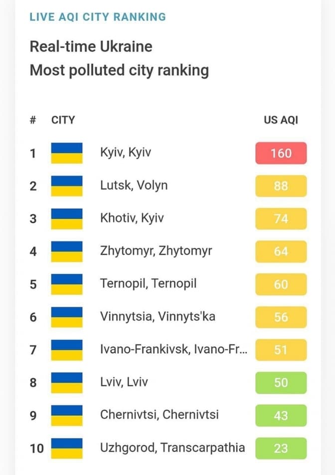 Перше місце, як місто з найнижчою якістю повітря, посів Київ, друге — Луцьк, третє — Хотів. Там наразі є проблеми з якістю кисню.