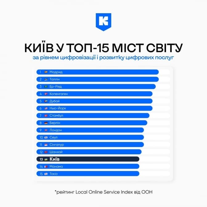 Київ увійшов у топ-15 найкращих міст світу за рівнем цифровізації і розвитку електронних сервісів. Про це повідомив заступник голови КМДА з питань здійснення самоврядних повноважень у сфері цифрового розвитку, цифрових трансформацій і цифровізації Петро Оленич.