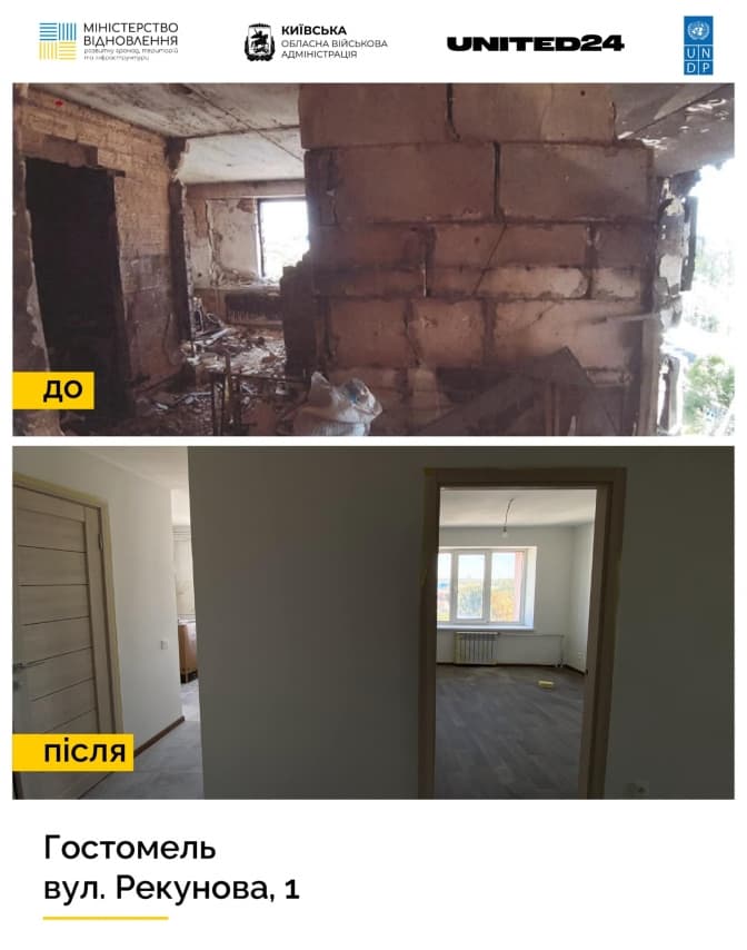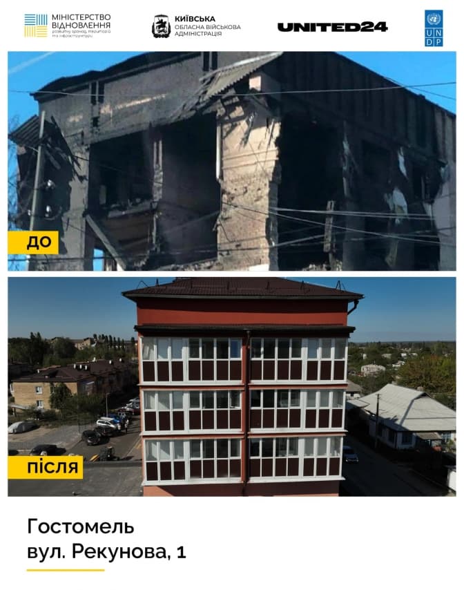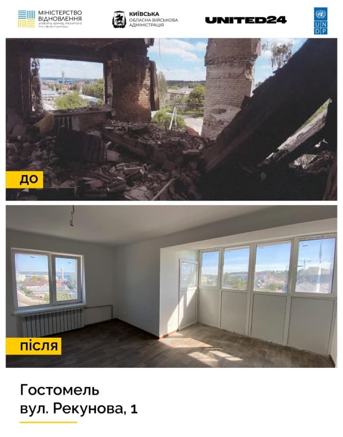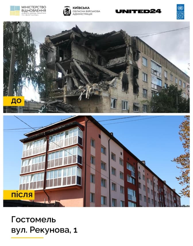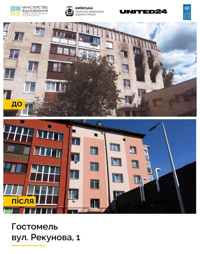 У Гостомелі Київської області коштом програми United24 відновили і здали в експлуатацію багатоквартирний житловий будинок. Про це повідомив голова Київської обласної військової адміністрації Руслан Кравченко.