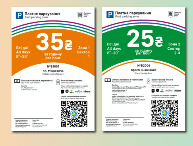 - QR-код, що дозволяє в один клік перейти до оплати за паркування, сплати штрафу, перегляду відеоінструкцій тощо.
