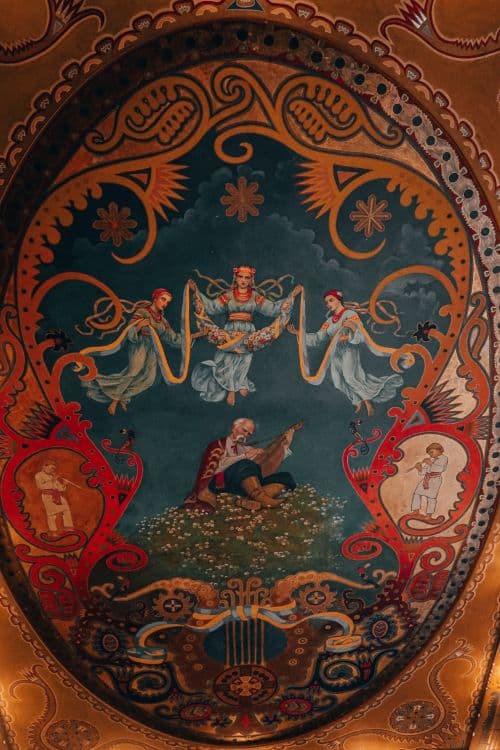 Центральною темою розпису стала музика, що відображала зв’язок між народним мистецтвом та українською національною ідентичністю. Плафон прикрашений нотами твору Миколи Лисенка, що символічно з’єднувало музичну спадщину сходу і заходу України. У залі також є погруддя Тараса Шевченка і Миколи Лисенка, виконані скульптором Григорієм Кузневичем, а по периметру стелі – ряд орнаментальних елементів, які вважаються одними з найкращих робіт Сосенка.