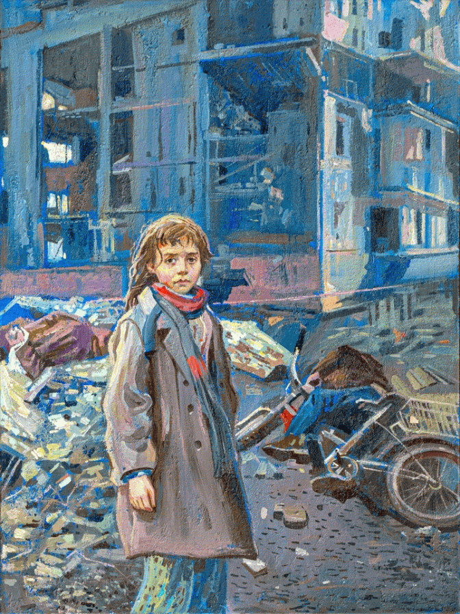«Марічка стояла серед руїн свого життя, серед уламків, які колись були її домом. Вона знала, що світ більше ніколи не буде таким, як раніше. Але також вона знала, що в її серці горить незламна віра в те, що Україна відродиться, що правда і справедливість переможуть. Цей біль, ці втрати ніколи не забудуться, але вони стануть основою для нової, сильнішої України», – описали картину її автори.