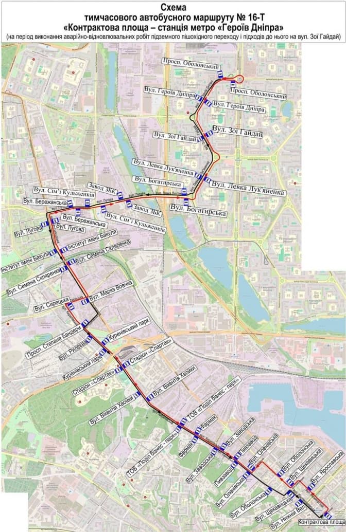 Відтак, з 19 жовтня до закінчення робіт (орієнтовно до 26 листопада) замість трамваїв № 16-К та автобусів № 11-ТК курсуватиме тимчасовий автобусний маршрут № 16-Т від станції метро “Героїв Дніпра” до Контрактової площі.
