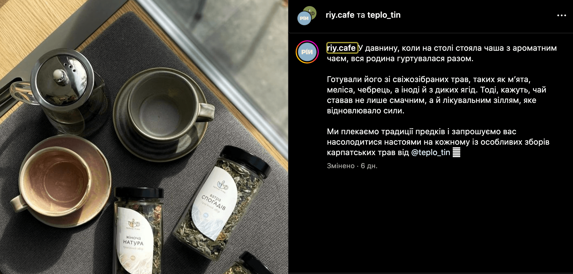 «Ми – кафе РІЙ і ми не ресторан української кухні. І так, ми про українську культуру, про своє, яке вражає. Ми сучасне кафе, де можна випити доброї кави, поговорити про все на світі і смачно поїсти. Щоправда, акценти кухні, як і всього закладу, стоять на використанні локального продукту і певній традиційності. Саме тому ми готуємо каву із зерна обсмаженого у Львові, використовуємо для чаю трави зібрані в Карпатах, пропонуємо скуштувати локальні фермерські продукти і спробувати наше авторське бачення певних традиційних страв», – писали на сторінці закладу.