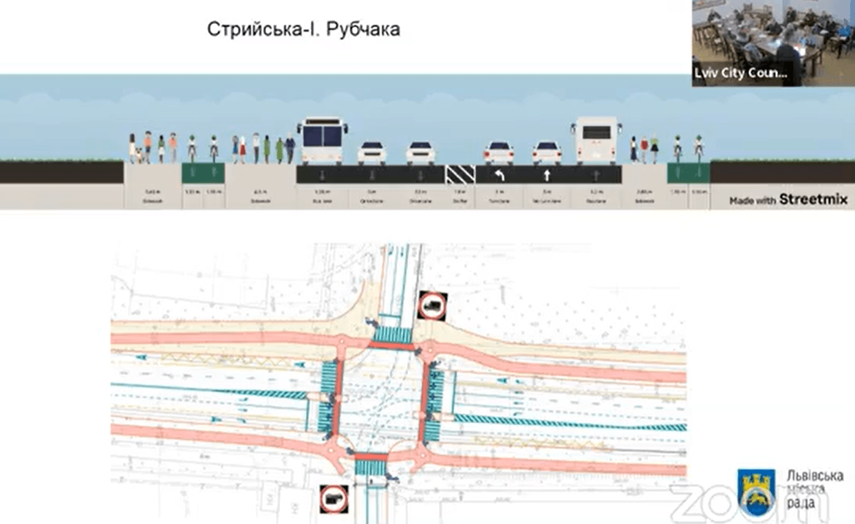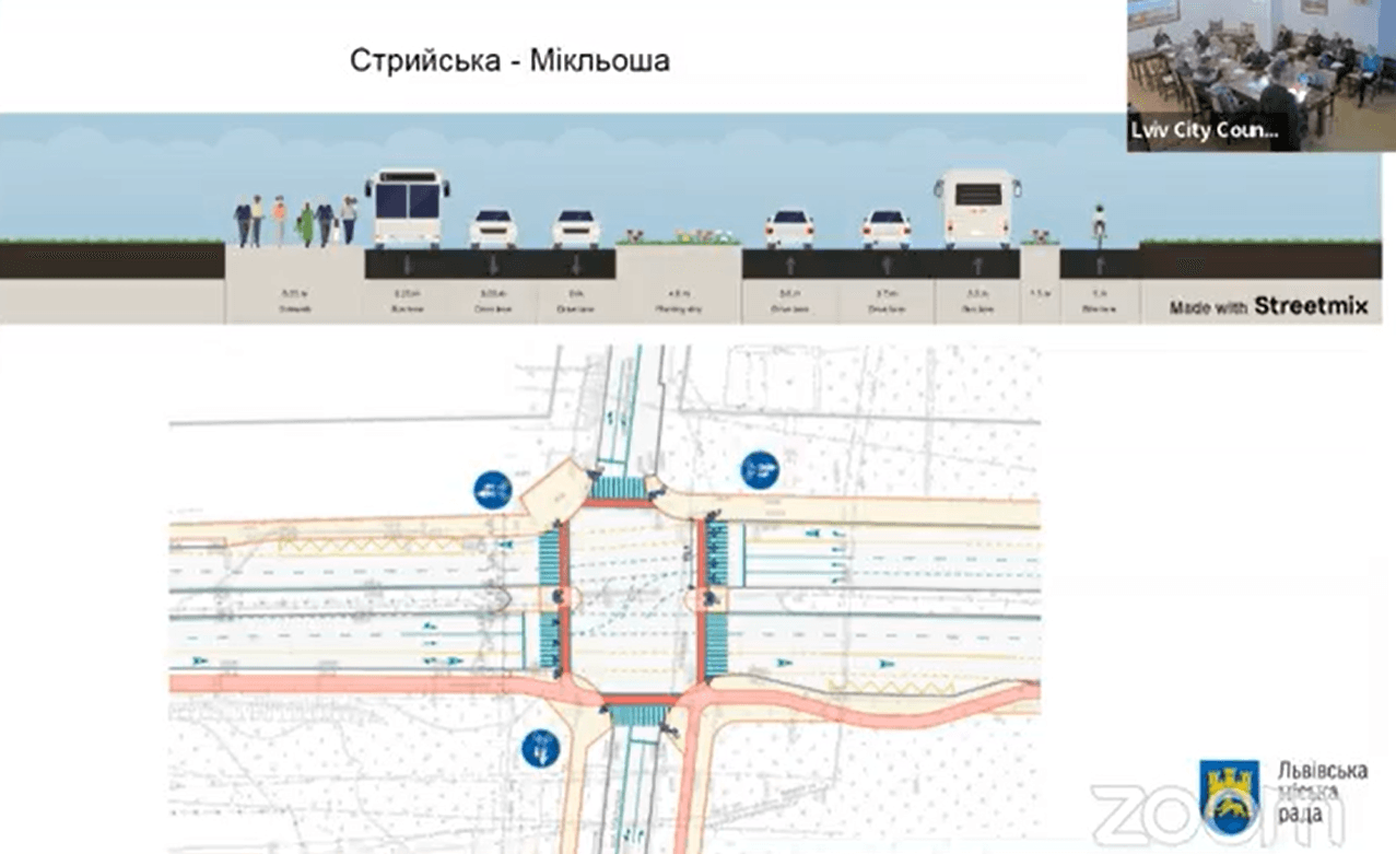 «Ключові зміни, які ми тут передбачаємо, – запровадження пріоритету громадського транспорту. Ми пропонуємо використати існуючу ширину проїжджої частини. На основному відрізку вул. Стрийської є три смуги, і вони є не нормативної ширини. Тому в межах існуючої ширини з трьох смуг зможемо облаштувати чотири в напрямку як з центру, так і до центру», – сказав директор департаменту міської мобільності та вуличної інфраструктури Львівської міської ради Олег Забарило.
